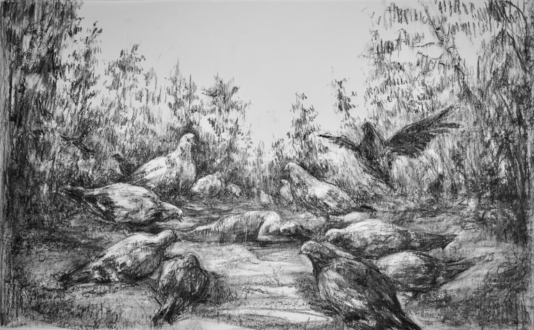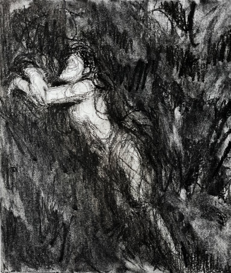 Self-portrait with pigeons, 2024. Charcoal on paper – 48 x 75 cm