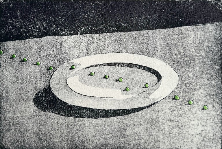 World peas, 2025. Etching (hand-colored) – 9.5 x 14.5 cm