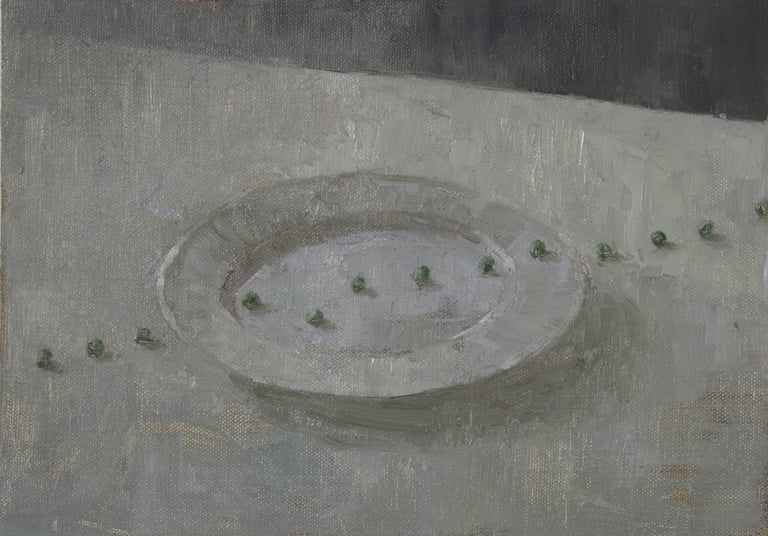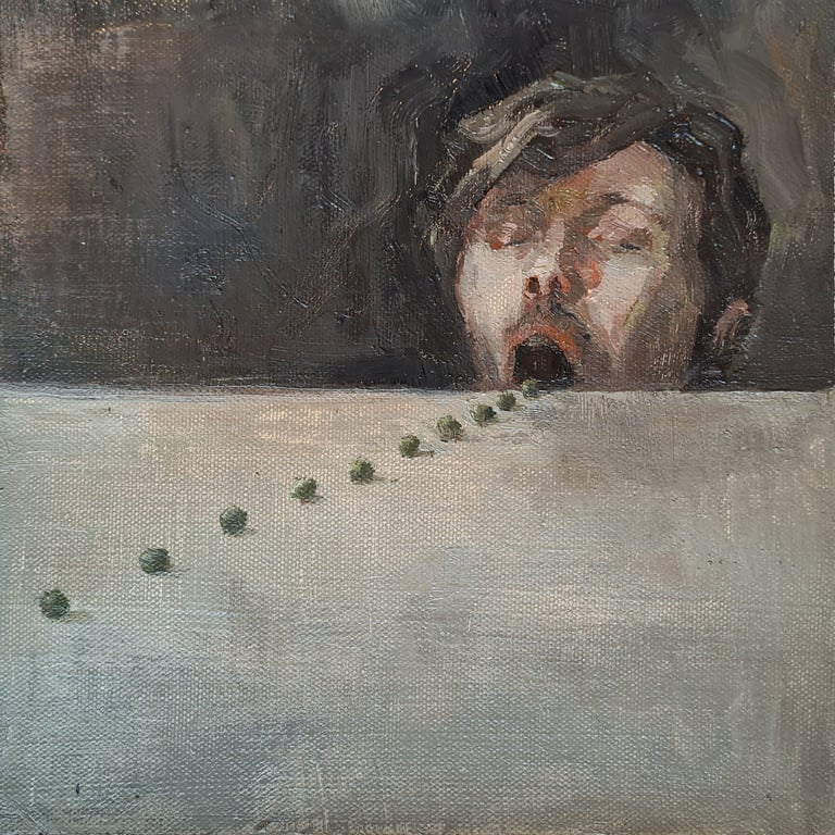 Peas out, 2025. Oil on canvas – 20 x 20 cm